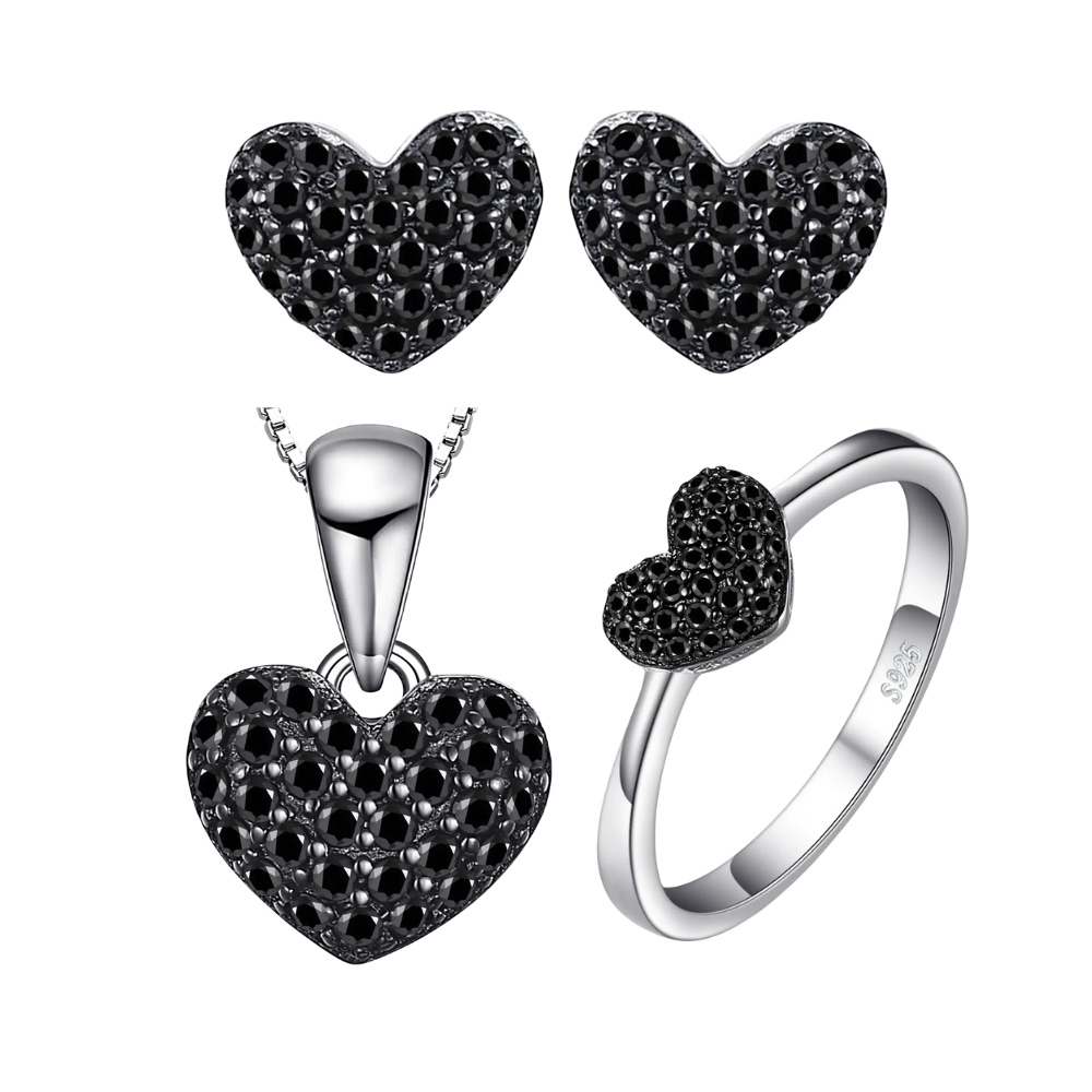 Elegant Black Spinel Heart Jewelry Set Ring Pendant & Earrings in 925 Silver
